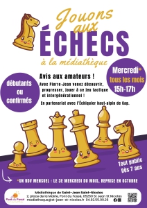 Avec Pierre-Jean venez découvrir, progresser, jouer à ce jeu tactique et intergénérationnel. En partenariat avec l'Échiquier haut-alpin de Gap. Pour débutants ou confirmés. Dès 7 ans.Entrée libre.