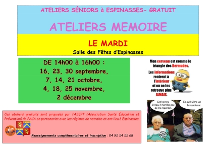 Ateliers gratuits le mardi de 14h à 16 hRenseignements et inscriptions : 04 92 54 52 68