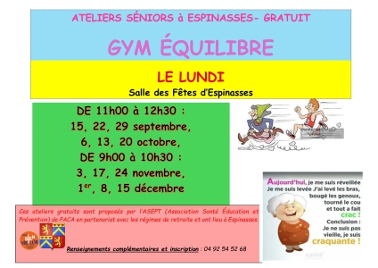 Ateliers seniors Gym équilibre Ateliers seniors Gym équilibre Prochaine session Du 20/01 à 11:00 au 20/10 à 12:30 Ical Secteur Serre-Ponçon Val d'Avance Lieu Espinasses Description Ateliers gratuits le lundi de 11h à 12h30 (jusqu'au 20 octobre) et de 9h00 à 10h30 (à partir du 3 novembre) Renseignements et inscriptions : 04 92 54 52 68 Voir le détail de l'événement Catégorie Apidaé